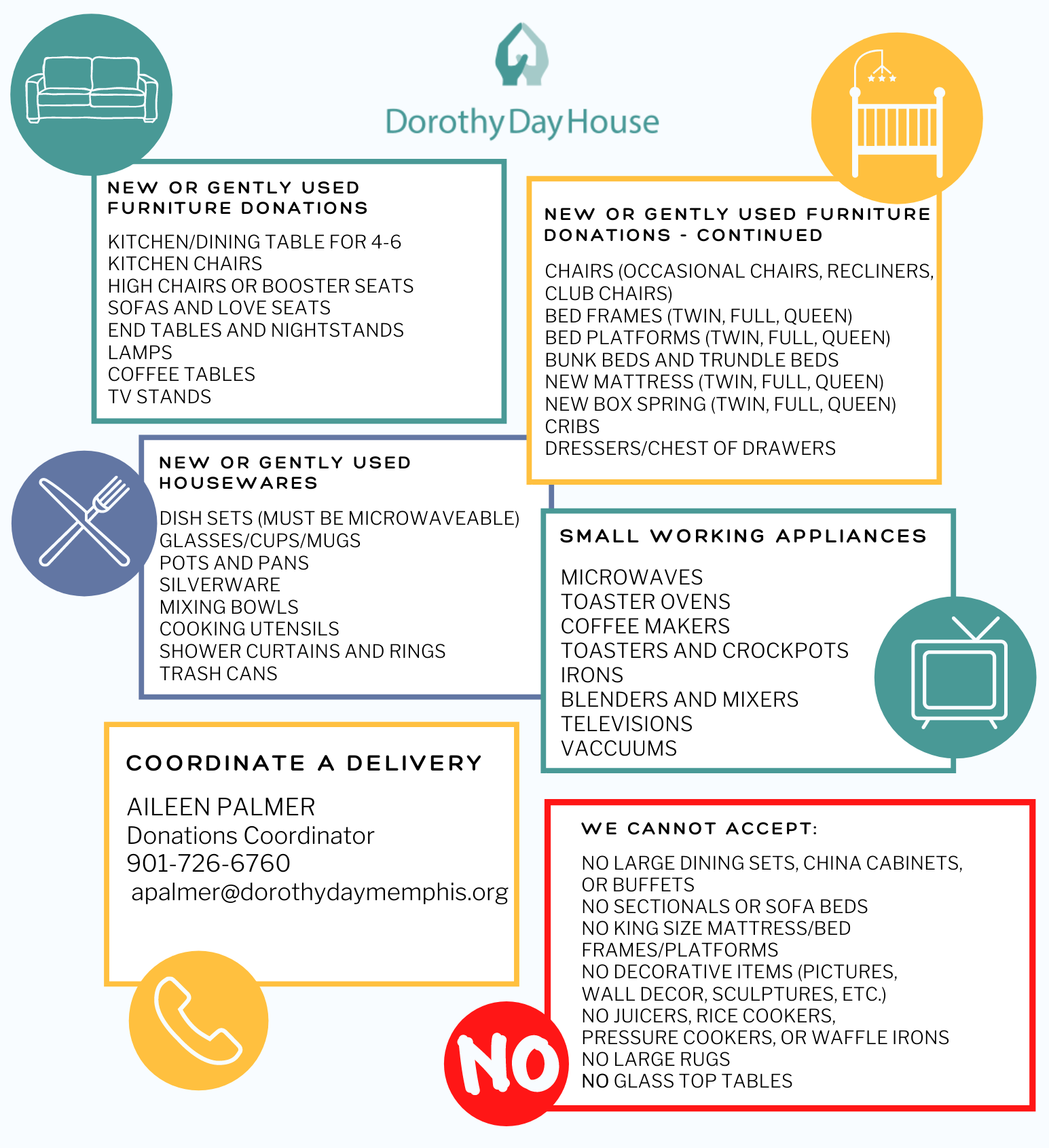 The Dorothy Day House accepts new and gently used furniture, housewares, and small appliances to support families transitioning out of DDH. Your donations help equip families with the essentials they need as they move toward independence. To view a list of acceptable items, please click the button below. Once reviewed, you can schedule a delivery drop-off at our Midtown storage facility. For questions or to coordinate a donation, please contact our Donations Coordinator, Sophia Rall, at srall@dorothydaymemphis.org or call (901) 726-6760. Please note that DDH does not have access to a large moving vehicle.
